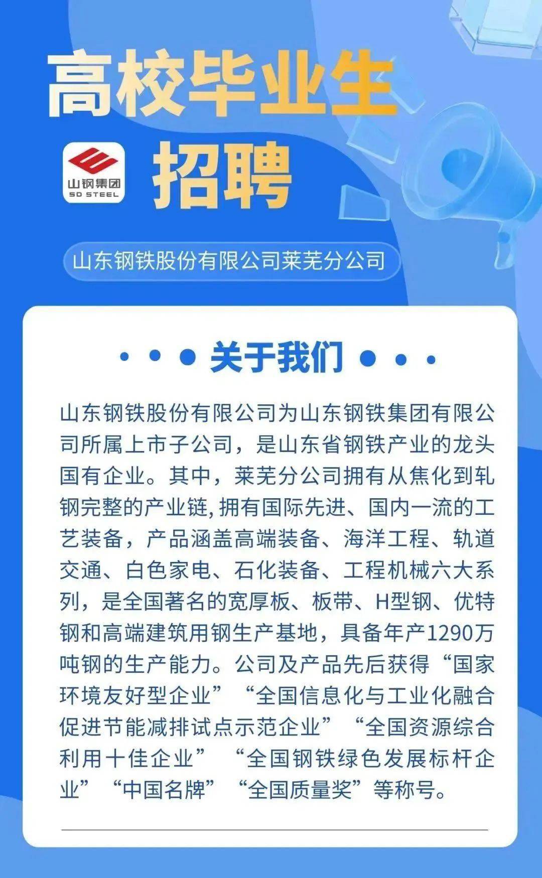 我們誠邀有激情、有夢想、有才華的你加入萊蕪鋼鐵集團,無論你是剛從校園走出的大學生,還是有一定工作經(jīng)驗的職場人士,這里都有屬于你的舞臺,讓我們一起創(chuàng)造輝煌,共同書寫美好的未來。