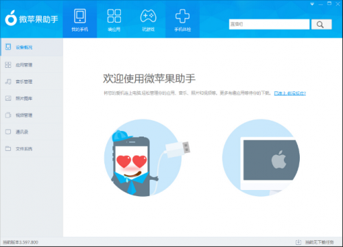 2、使用:安裝完成后,打開蘋果助手,根據(jù)您的需求進(jìn)行同步數(shù)據(jù)、備份資料、下載應(yīng)用等操作。